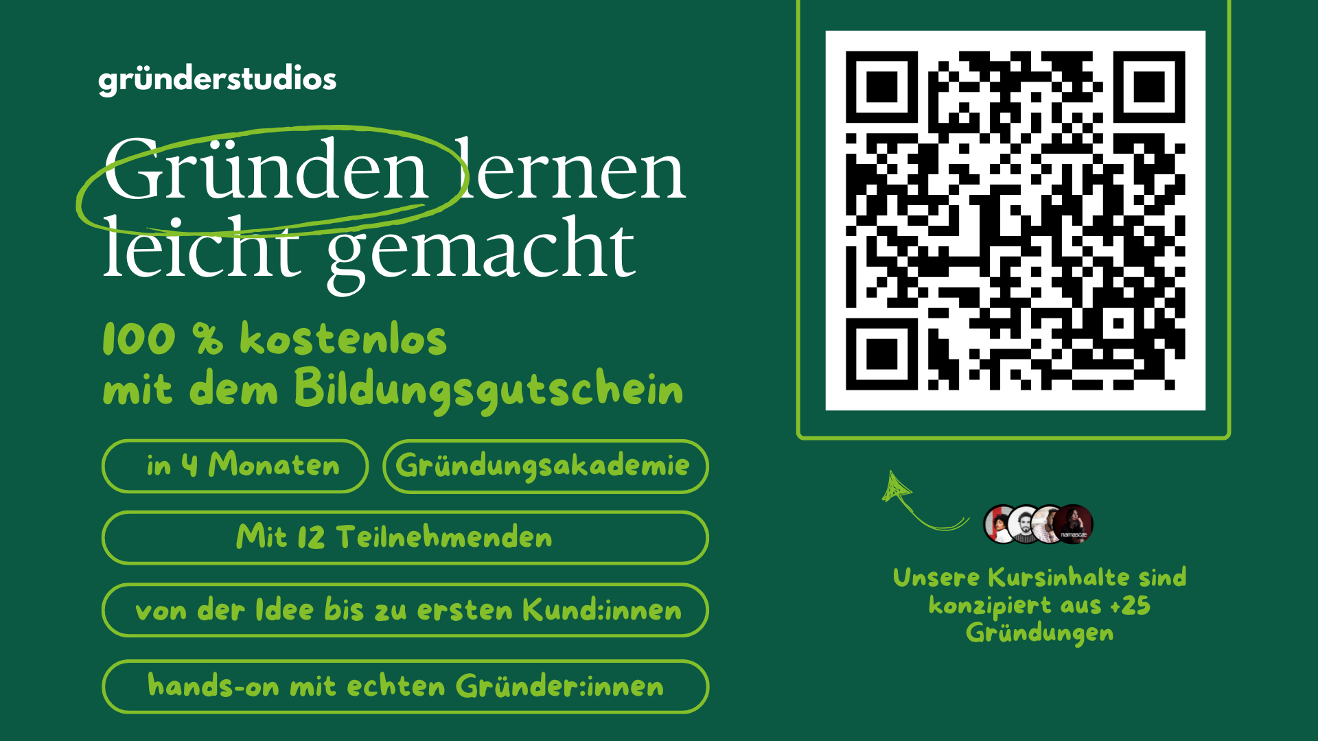 Wir suchen zukünftige Gründer:innen & Selbstständige, die ihren Bildungsgutschein einlösen wollen, um in 4 Monaten alles über die Gründung lernen in direkter Zusammenarbeit mit erfahrenen Gründer:innen. Hier mehr erfahren